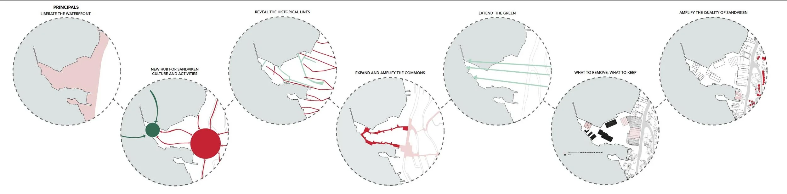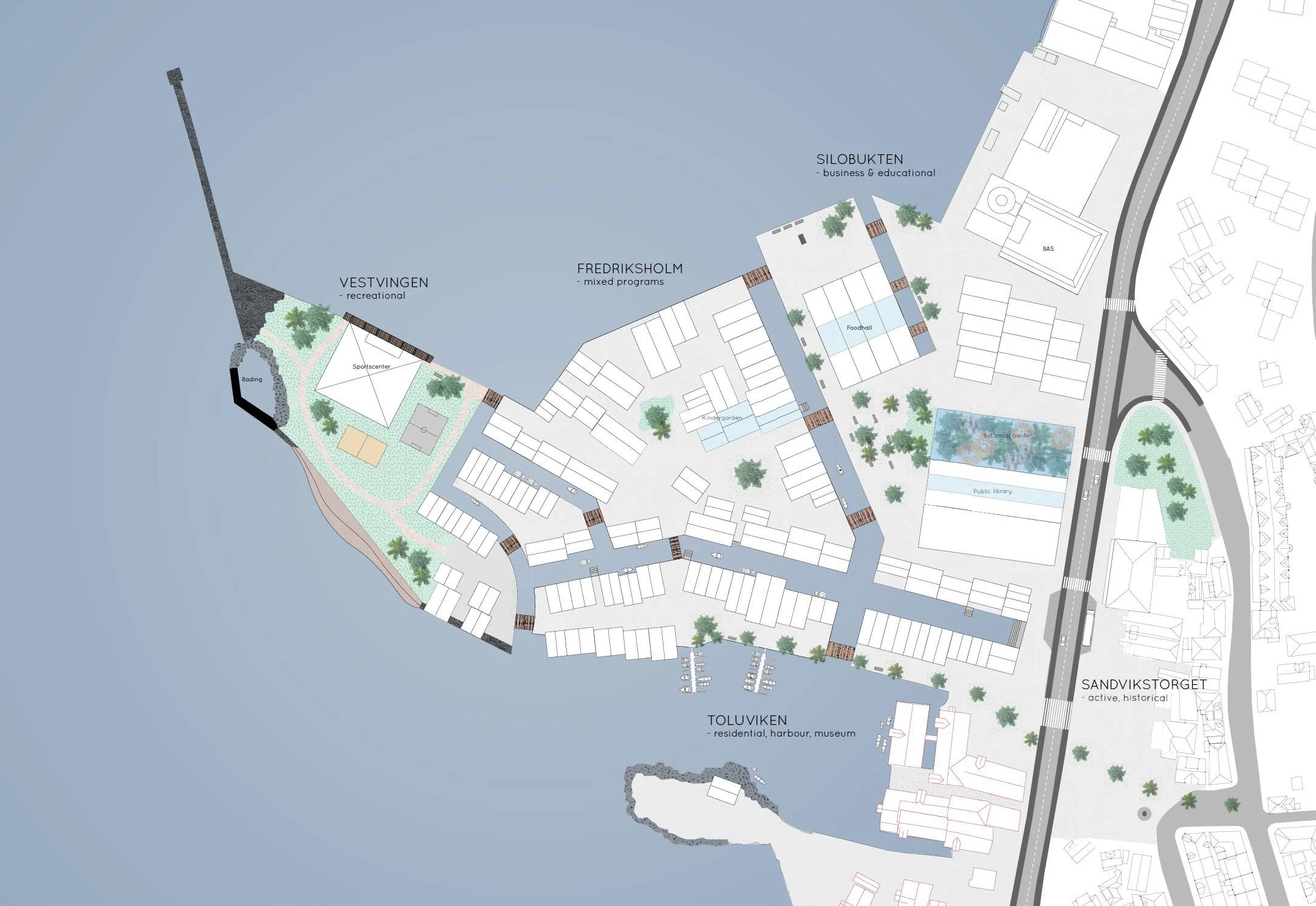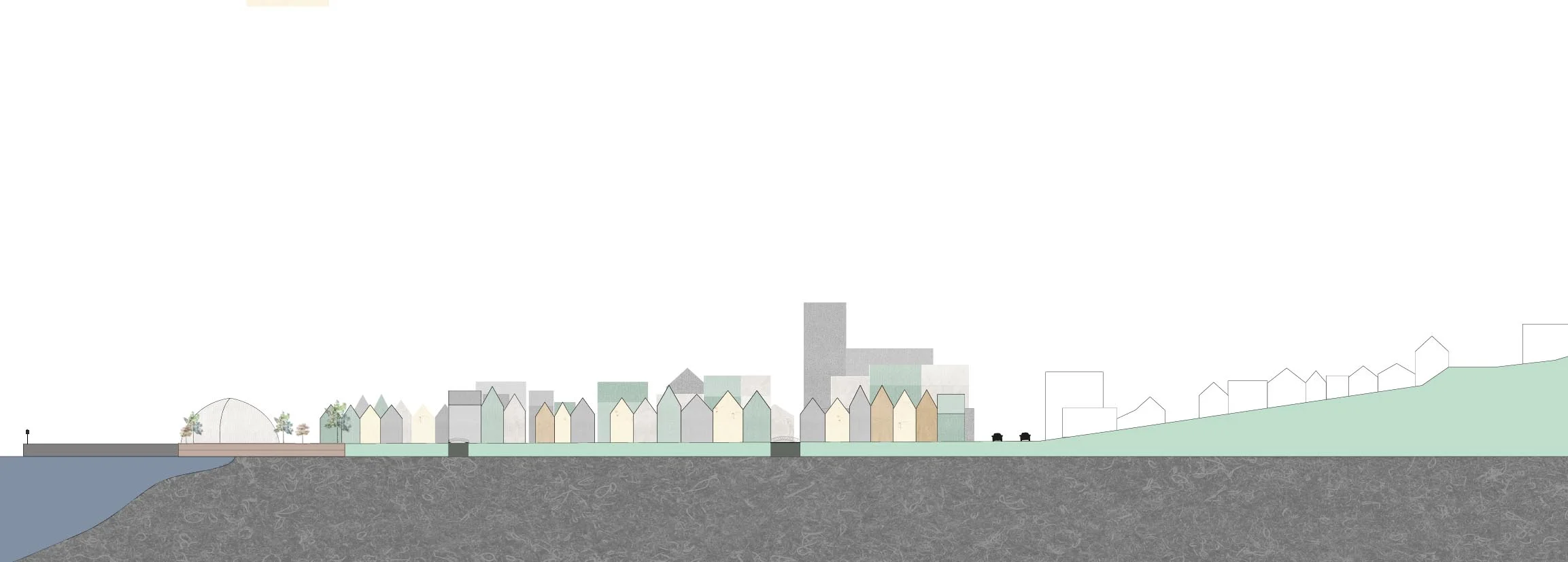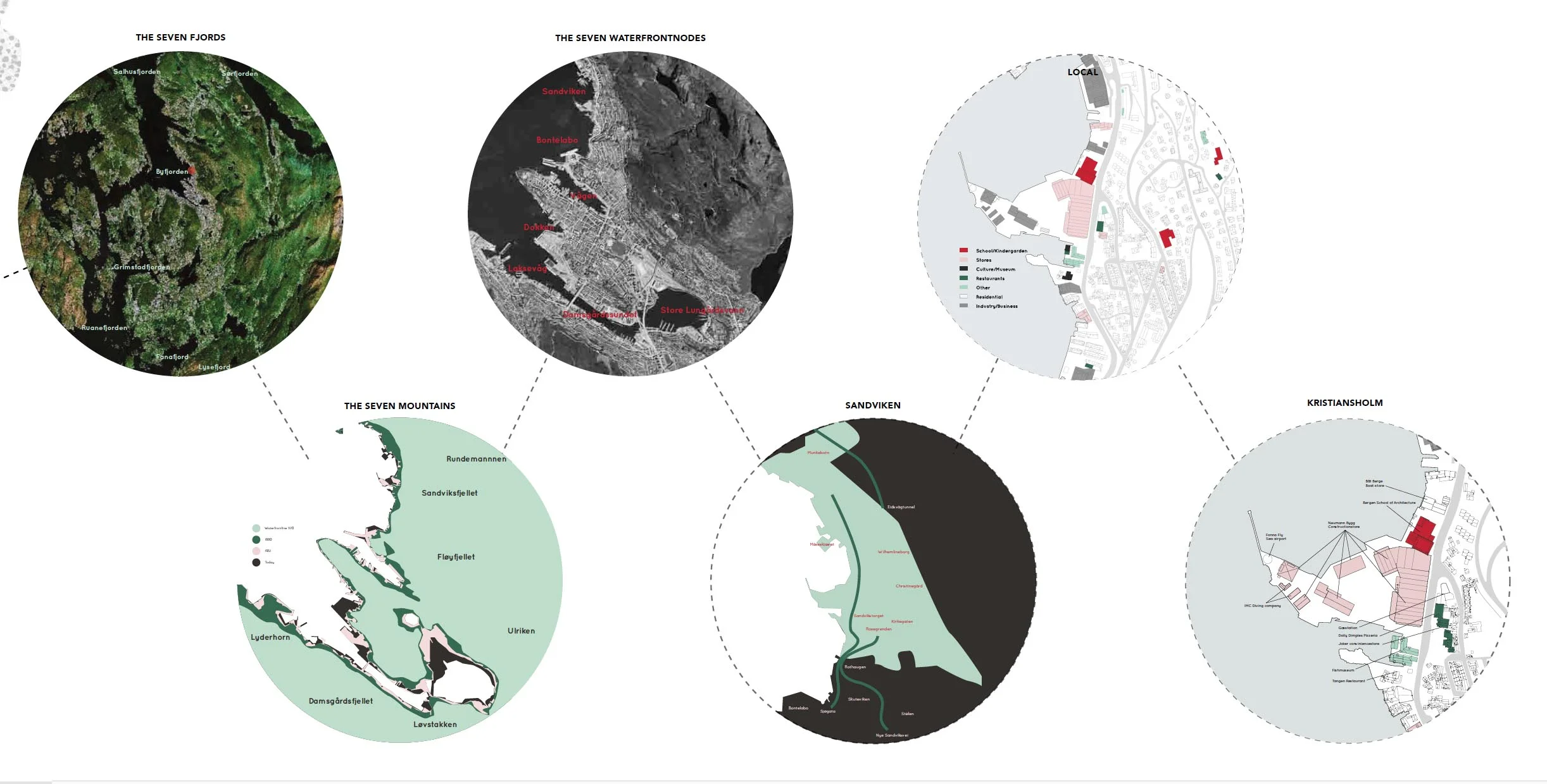 The proposal shows an holistic approach to living typologies and a greater connection from the peninsula ,Kristiansholm, to Sandviken, which is to often that the planners stay within their boundaries. But with the research of this project, we will explore an idea of “thickness” of these boundaries that define the area, whether it is by revealing new and historical lines, creating open areas that visually connect the waterfront to the hillside, porous buildings that enable new movement or a new area of densification that is seen as support to the regeneration of Sandviken as one of the “centers” in Bergen.